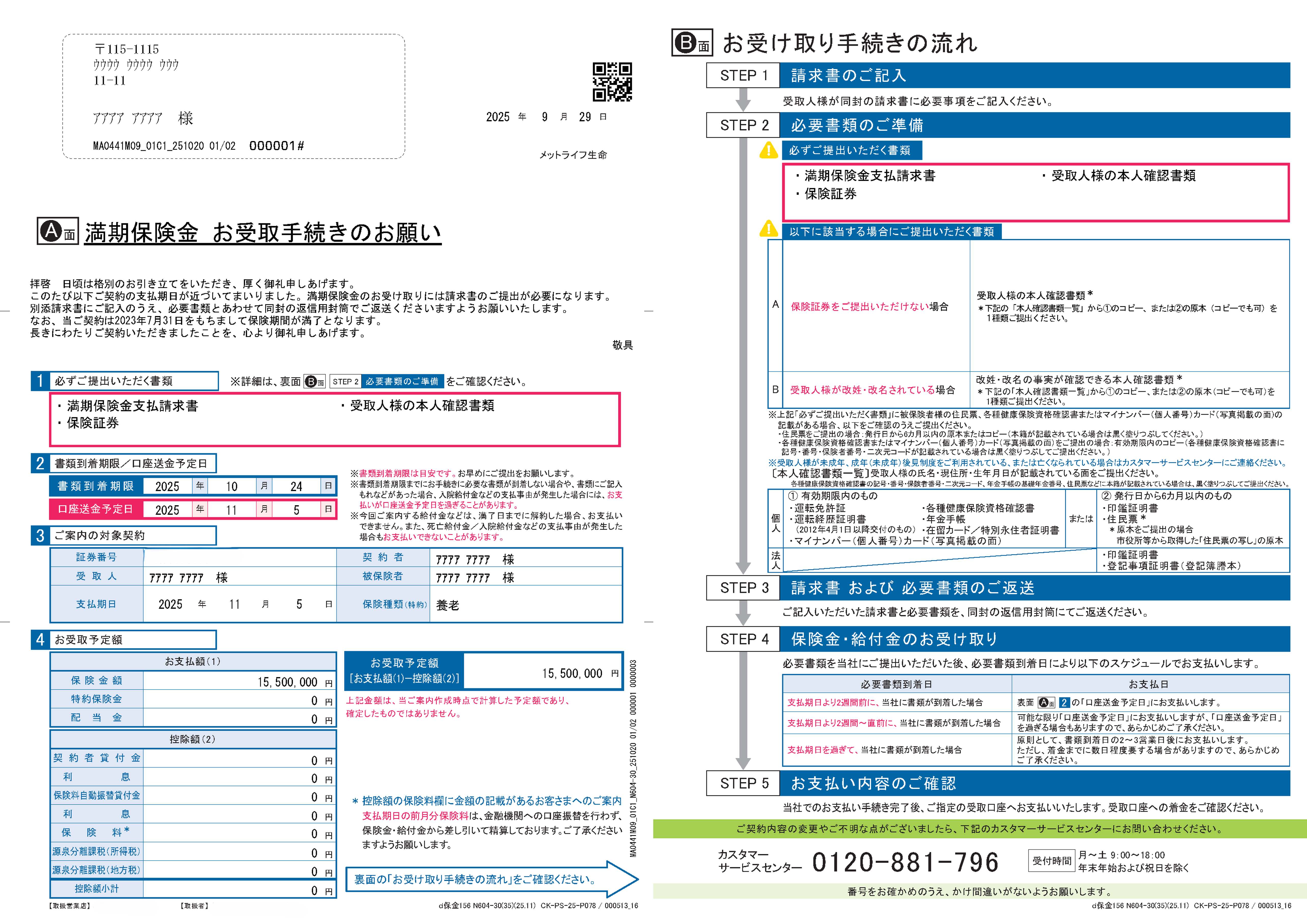 満期保険金や生存給付金などをご請 求いただく書類です。氏名、送金方法などをもれなくご記入いただき、ご返送ください。