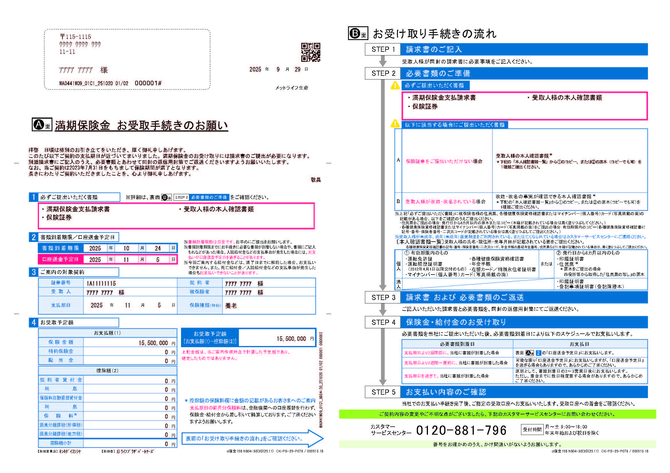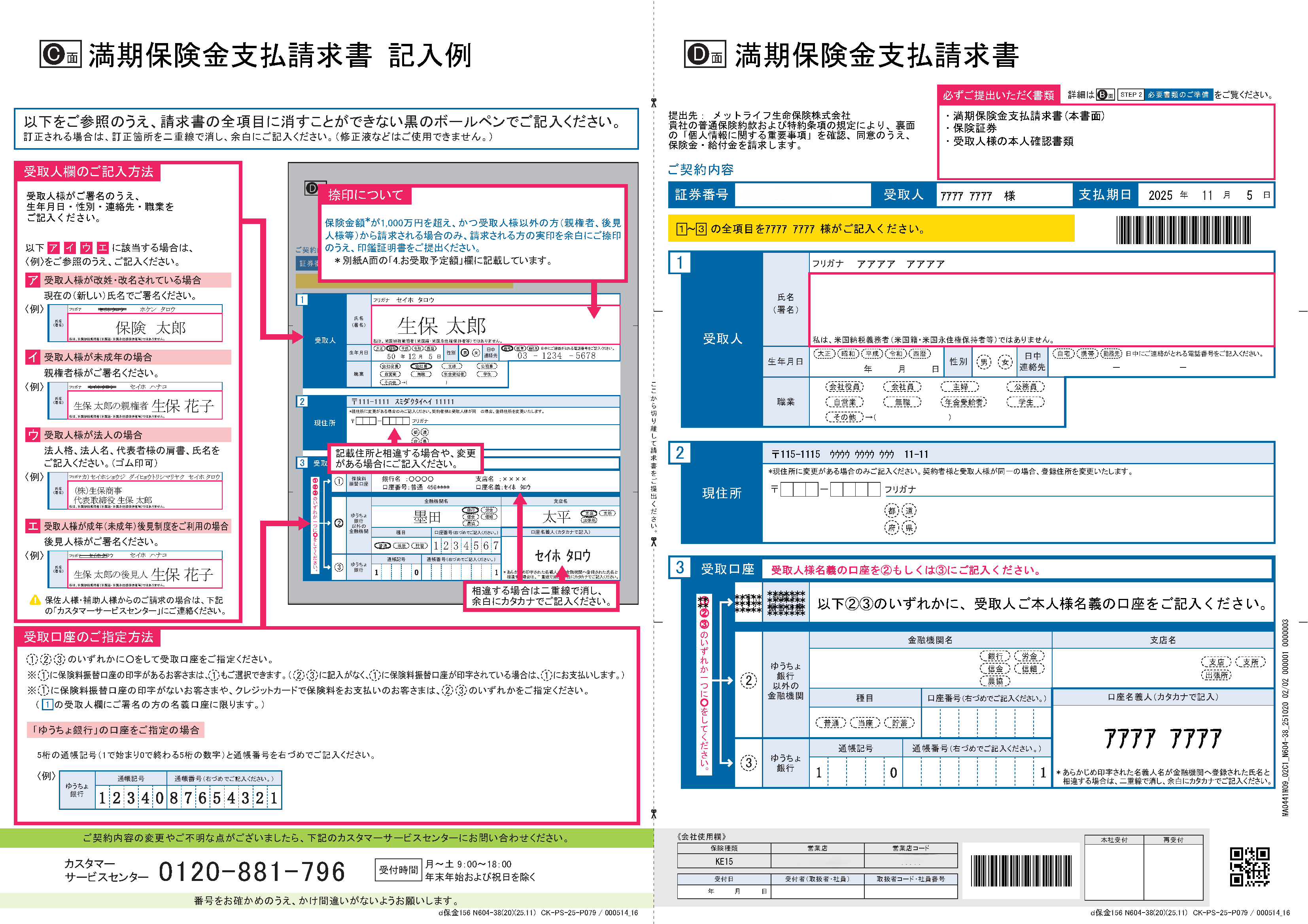満期保険金や生存給付金などをご請 求いただく書類です。氏名、送金方法などをもれなくご記入いただき、ご返送ください。